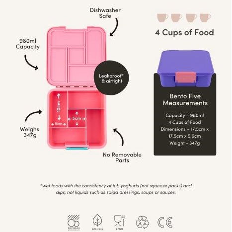 The Bento Five is perfect for children who prefer variety or kids that are fussy eaters that don't like their food touching. Switch things up each day and create endless combinations of nutritious food in 5 bite-sized compartments! With no removable parts this is a great choice for Kindy kids.